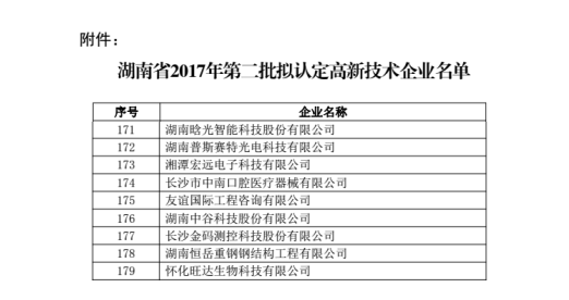2017年12月1日,湖南省高新技術企業(yè)認定管理工作網(wǎng)公布了關于公示湖南省2017年第二批擬認定高新技術企業(yè)名單的通知,湖南晗光智能科技股份有限公司位列其中。